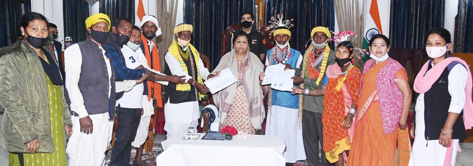 राज्यपाल अनुसुईया उइके से राजभवन में कवर्धा जिले के बैगा आदिवासियों के प्रतिनिधिमण्डल ने भेंटकर अपनी समस्याओं के संबंध में ज्ञापन सौंपा। प्रतिनिधिमण्डल ने राज्यपाल से भेंट के लिए पहले से मुलाकात का समय नहीं लिया था। राज्यपाल को जब यह बताया गया कि वे कबीरधाम जिले से केवल उनसे मिलने के लिए आए हैं तब उन्होंने प्रतिनिधिमण्डल को राजभवन में बुलाकर उनकी समस्याएं सुनीं। राज्यपाल ने कवर्धा जिले के कलेक्टर से दूरभाष से बात कर उनकी मांगों के संबंध में चर्चा कर उसे दूर करने के निर्देश दिए। उन्होंने कलेक्टर से कहा कि वे प्रतिनिधिमण्डल से मुलाकात करें और उनकी समस्याओं पर आवश्यक कार्यवाही करें। राज्यपाल ने प्रतिनिधिमण्डल से कहा कि अपने अधिकारों के प्रति सजग रहें और संगठित होकर अपने समुदाय की बेहतरी के लिए प्रयास करें। उन्होंने कहा कि वे हमेशा से वंचित वर्ग के अधिकारों के संरक्षण के लिए प्रयत्न करती हैं।