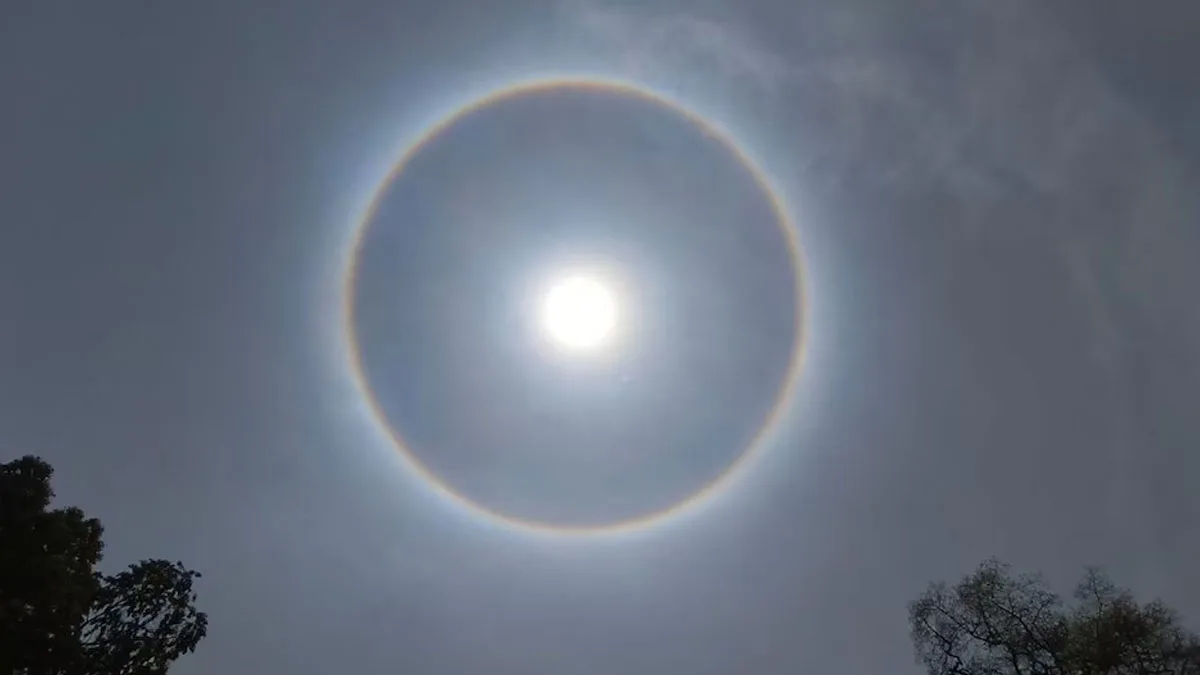 इस तस्वीर में आसमान में सूरज के चारो ओर अचानक इंद्रधनुषी गोला बना था। लोगों के लिए सूरज के चारों तरफ ऐसा इंद्रधनुषी गोला हर किसी के लिए हैरान कर देने वाला विषय बन गया। कई लोग इस खगोलीय घटना को अपने कैमरे में रिकॉर्ड कर चुके हैं। लोगों का कहना है कि ज्यादातर बारिश के मौसम में आसमान में इंद्रधनुष नजर आता है, लेकिन बिना बारिश के इस तरह का नजारा एक अलग घटना है, जो हर किसी को हैरान कर रहा है।