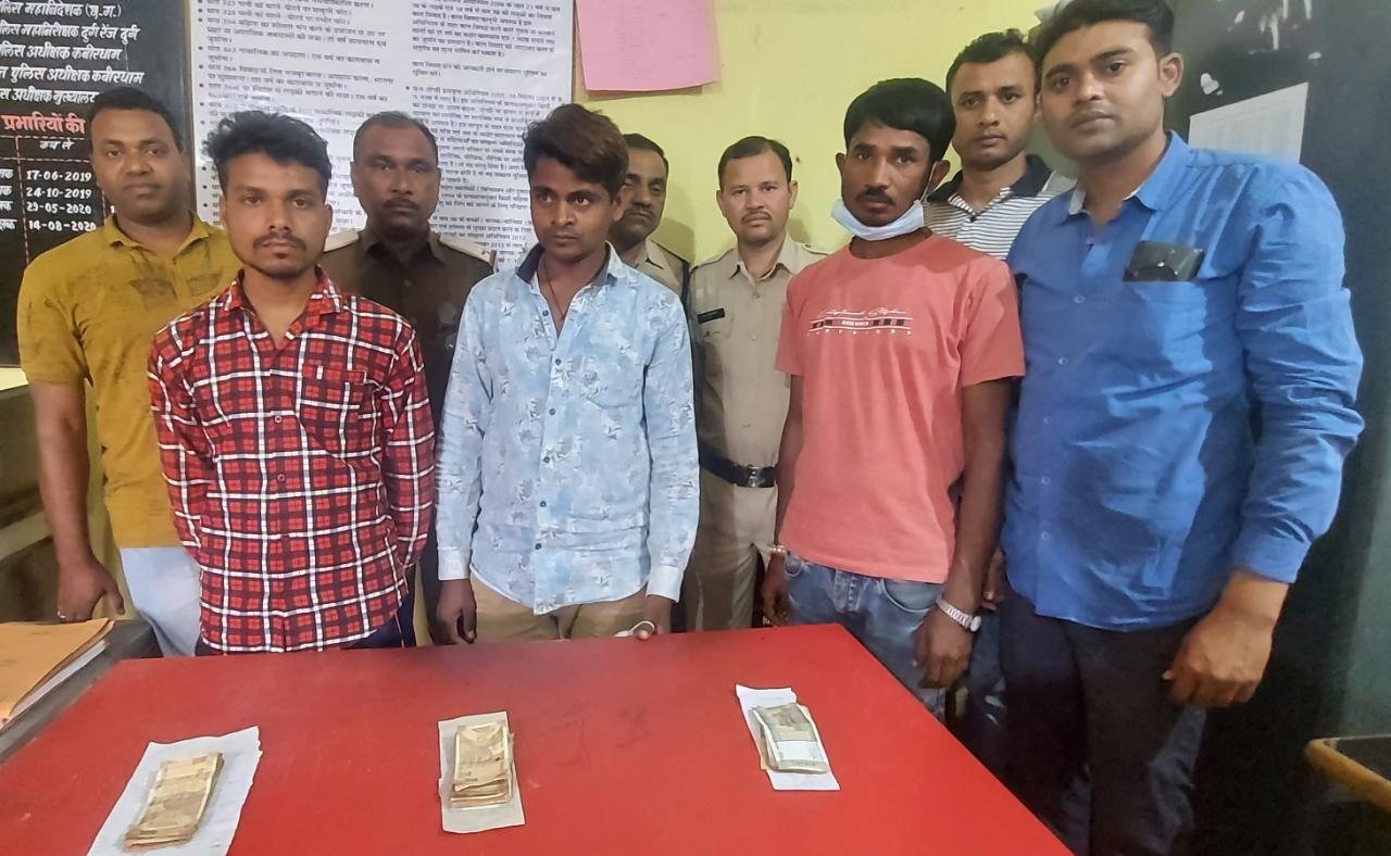 पुलिस अधीक्षक शलभ कुमार सिन्हा के निर्देशन, उप पुलिस अधीक्षक बी.आर.मंडावी, उप पुलिस अधीक्षक HQ पनिक राम कूजूर के पर्यवेक्षण में एवं निरीक्षक मुकेश सोम थाना प्रभारी कोतवाली कवर्धा तथा चौकी प्रभारी उपनिरीक्षक नवरतन कश्यप के कुशल नेतृत्व में दिनांक 11.02.21 को दौरान जुर्म जरायम पतासाजी की मुखबिर से सूचना मिला की ग्राम गोछिया,बंदौरा,बम्हनी में आम जगह पर ग्राम गोछिया से दुर्गेश कौशिक, ग्राम बंदौरा से भाई राम यादव एवं ग्राम बम्हनी से अशोक कौशिक अंको पर रुपए पैसों का दांव लगाकर सट्टा पट्टी लिखकर अवैध धन लाभ अर्जित कर रहा है की की सूचना पर रेड कार्यवाही किया। मौके पर आरोपी 01.अशोक कौशिक पिता आधार कौशिक उम्र 30 वर्ष साकिन बम्हनी 02. दुर्गेश पिता संतोष कौशिक उम्र 26 वर्ष साकिन गोछिया 03. भाई राम पिता शिवराम यादव उम्र 38 वर्ष साकिन झिरौनी चौकी बाजार चारभाठा थाना कवर्धा को मौके पर अंको में रुपए पैसों का हार जीत का दांव लगाकर सट्टा पट्टी लिखते पकड़े जिनके कब्जे से कुल नगदी रकम 2850 रुपये, 03 नग सट्टा पट्टी, डॉट पेन को जप्त कर कब्जा पुलिस लिया गया। आरोपी का कृत्य अपराध धारा सदर का पाये जाने से अपराध क्रमांक 00/21 धारा 4 (क) सट्टा एक्ट अपराध पंजीबद्ध कर विवेचना में लिया गया। इस कार्यवाही में चौकी प्रभारी उपनिरीक्षक नवरतन कश्यप,सहायक उपनिरीक्षक राम भजन सिन्हा ,प्रआर. लवकेश खरे,आरक्षक शंकर निषाद, शशांक तिवारी , शेष नारायण सिन्हा का सराहनीय योगदान रहा।