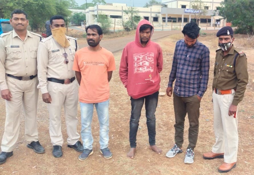 विश्वसनीय मुखबीर से सूचना मिला की आरोपीयांन 01 रिधु उर्फ सिध्दू साहू पिता तुलाराम साहू उम्र 27 साल साकिन सिल्हाटी थाना बोडला , 2 , प्रभु गिरी गोस्वामी पिता प्रेम गिरी गोस्वामी उस 34 साल साकिन डीपो पारा पोड़ी , 3.कन्हैया उर्फ काव्हा मेरावी पिता परदेशी राम मेरावी उम्र 29 साल साकिन दशंगपुर खुर्द थाना बोड़ला का होना बताया जिनसे कोतवाली टीम द्वारा पूछताछ करने पर अपना जुर्म स्वीकार कर ठगी से प्राप्त सोने को आरोपियों के साथी तांत्रिक बाबा दादू , विनोद , आकाश गिरी गोस्वामी निवासी सलैया थाना धुमा जिला – सिवनी म.प्र.द्वारा लेकर भाग जाना तथा घटना में प्रयुक्त मोटर सायकल प्लेटिना सोल्ड किमती 50,000 / रू तथा बटवारे का रकम 3,000 / रू तथा दो नग मोबाईल किमती 30,000 / रू कुल जुमला 83,000 / रू को जप्त कर कब्जा पुलिस लिया गया आरोपियों को गिरफ्तार कर ज्यूडिसियल रिमाण्ड पर भेजा गया है। इस कार्यवाही में थाना प्रभारी मुकेश सोम के नेतृत्व में सउनि संजय मेरावी , प्र.आर .297 चुम्मन साहू , आर .456 हिरेन्द्र साहू , आर .702 उमाशंकर साहू , आर . 672 सुधीर शर्मा सै0-80 अनिल पाण्डेय का सराहनीय योगदान रहा।
