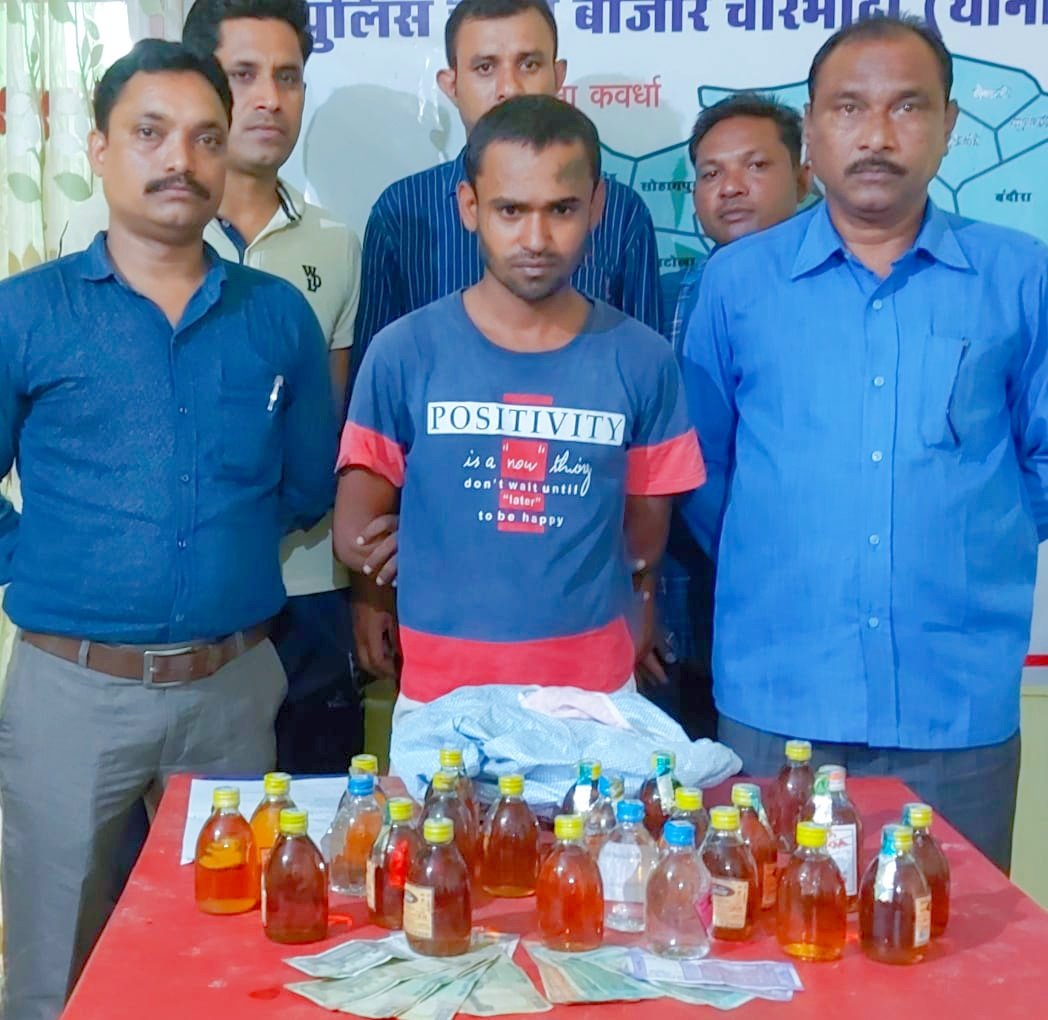 अवैध शराब, गांजा, एवं अन्य मादक पदार्थों की अवैध बिक्री एवं परिवहन पर अंकुश लगाकर क्षेत्र को अपराध मुक्त करने के उद्देश्य से चौकी बाजार चारभाठा पुलिस टीम के द्वारा कबीरधाम पुलिस अधीक्षक शलभ कुमार सिन्हा के निर्देशन एवं अतिरिक्त पुलिस अधीक्षक सुश्री ऋचा मिश्रा तथा उप. पुलिस अधीक्षक मुख्यालय पी.आर.कुजूर,