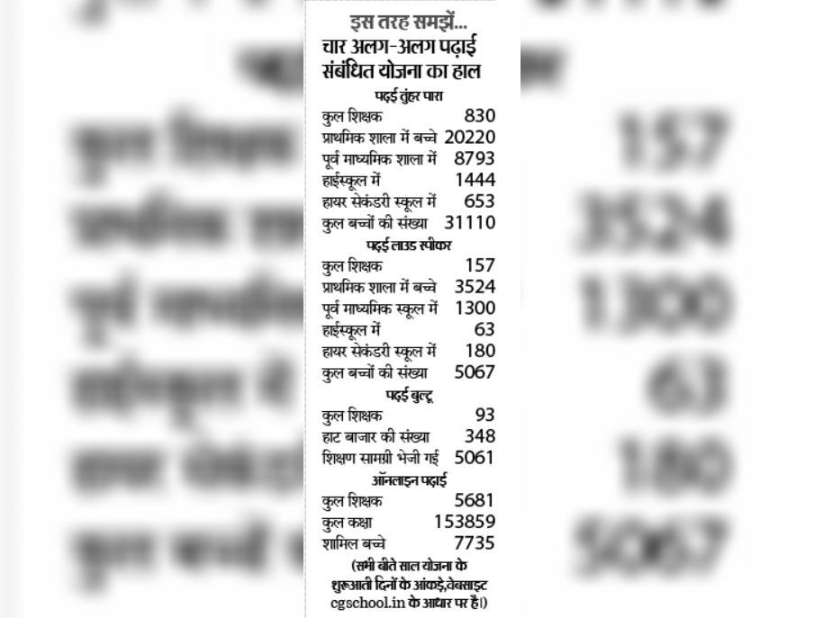 जिले में बीते शिक्षा सत्र में ऑनलाइन पढ़ाई की स्थिति खराब थी। शुरुआती दिनों में डीईओ कार्यालय से मॉनिटरिंग की गई। लेकिन बाद में ध्यान नहीं दिया जा रहा। बीते शिक्षा सत्र में ऑनलाइन और ऑफलाइन शैक्षणिक गतिविधियों में बच्चों की शैक्षणिक उपलब्धियों का मूल्यांकन करने की योजना थी। तीन बार आकलन परीक्षा ली गई। इसके लिए cgschool.inऔर इन योजनाओं में शिक्षा ग्रहण करने वाले सभी बच्चों के नामों की एंट्री कर उन्हें पढ़ाने वाले शिक्षकों द्वारा उनकी शैक्षणिक उपलब्धियों की एंट्री करने का प्रावधान किया। बच्चों के नाम और मूल्यांकन की एंट्री करने के संबंध में ऑनलाइन प्रशिक्षण एससीईआरटी द्वारा आयोजित की गई।