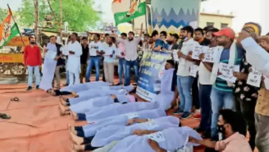 अनूठा प्रदर्शन:कफन ओढ़कर लेटे युवा कांग्रेसी, चौक पर पकौड़े भी तले, स्टूडेंट्स को बांटे लॉलीपॉप