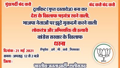 कवर्धा,20 मई 2021/ जिला भाजपा अध्यक्ष अनिल सिंह के नेतृत्व कल धरना प्रदर्शन किया जायेगा। कांग्रेस के टूलकिट उजागर होने…